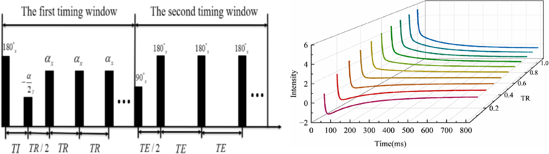 T1-T2二维谱能够同时提供纵向弛豫(T1)与横向弛豫(T2)信息,是非常规储层流体识别、组分分离与饱和度预测的重要数据基础。然而,传统的IR CPMG与SR CPMG等采集序列往往面临“采集速度与谱分辨率难以兼顾”的矛盾:为保证信噪比与分辨率,测量通常需要较长的极化时间,信号采集时间较长。围绕上述问题,团队提出一种基于IR BSSFP CPMG的新型脉冲序列,将信号采集过程分为两个时窗:第一窗口采用反转恢复 平衡稳态自由进动(IR BSSFP)加载纵向弛豫信息,利用低翻转角与较低射频发射功率,降低对完全极化的依赖;第二窗口采用CPMG回波串加载横向弛豫信息,实现横向弛豫的高效采集。在数据反演中采用多参数Tikhonov正则化方法抑制噪声与伪峰,提高反演的稳定性。