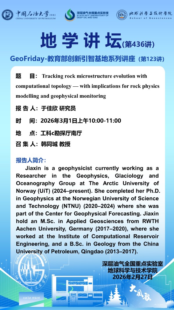 【地学讲坛第436讲】关于于佳欣研究员《Tracking rock microstructure evolution with computational topology — with implications for rock physics modelling and geophysical monitoring》学术报告的通知
