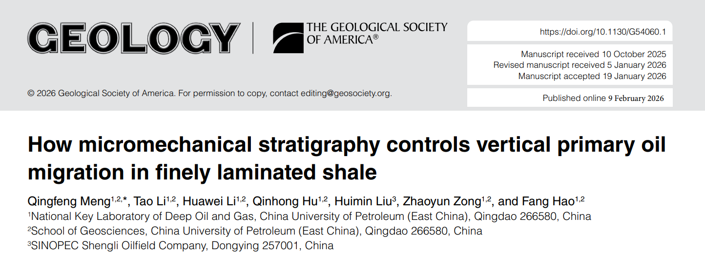 论文信息:Q Meng, T Li, H Li, Q Hu, H Liu, Z Zong, F Hao. How micromechanical stratigraphy controls vertical primary oil migration in finely laminated shale. Geology, 2026, doi:10.1130/G54060.1