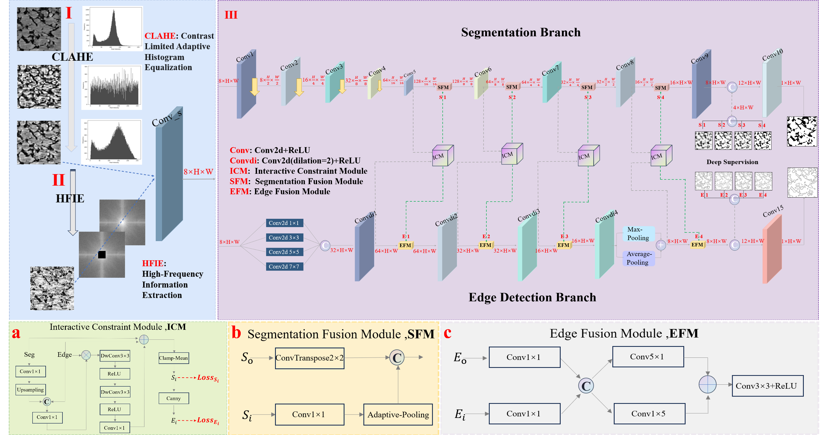 为此,本提出了一种融合边缘特征的智能DRP分析框架。首先,设计了面向少样本学习的EdgeSegNet网络,同步实现图像分割与边缘检测。该方法包含三大创新模块:1)信息增强共享层(IESL),结合CLAHE对比度增强与傅里叶变换提取高频信息,提升图像细节表达;2)交互约束模块(ICM),通过分割与边缘任务的深度交互与约束,增强任务间的互补性;3)深度监督策略,通过逐层加权监督提升网络对多尺度特征的捕捉能力。其次,在力学性质预测阶段,本文将分割结果与边缘检测结果作为双通道输入,引入多门混合专家网络(MMOEROCK),实现体积模量与剪切模量的同步预测,使边缘特征作为地质先验信息有效约束预测过程。