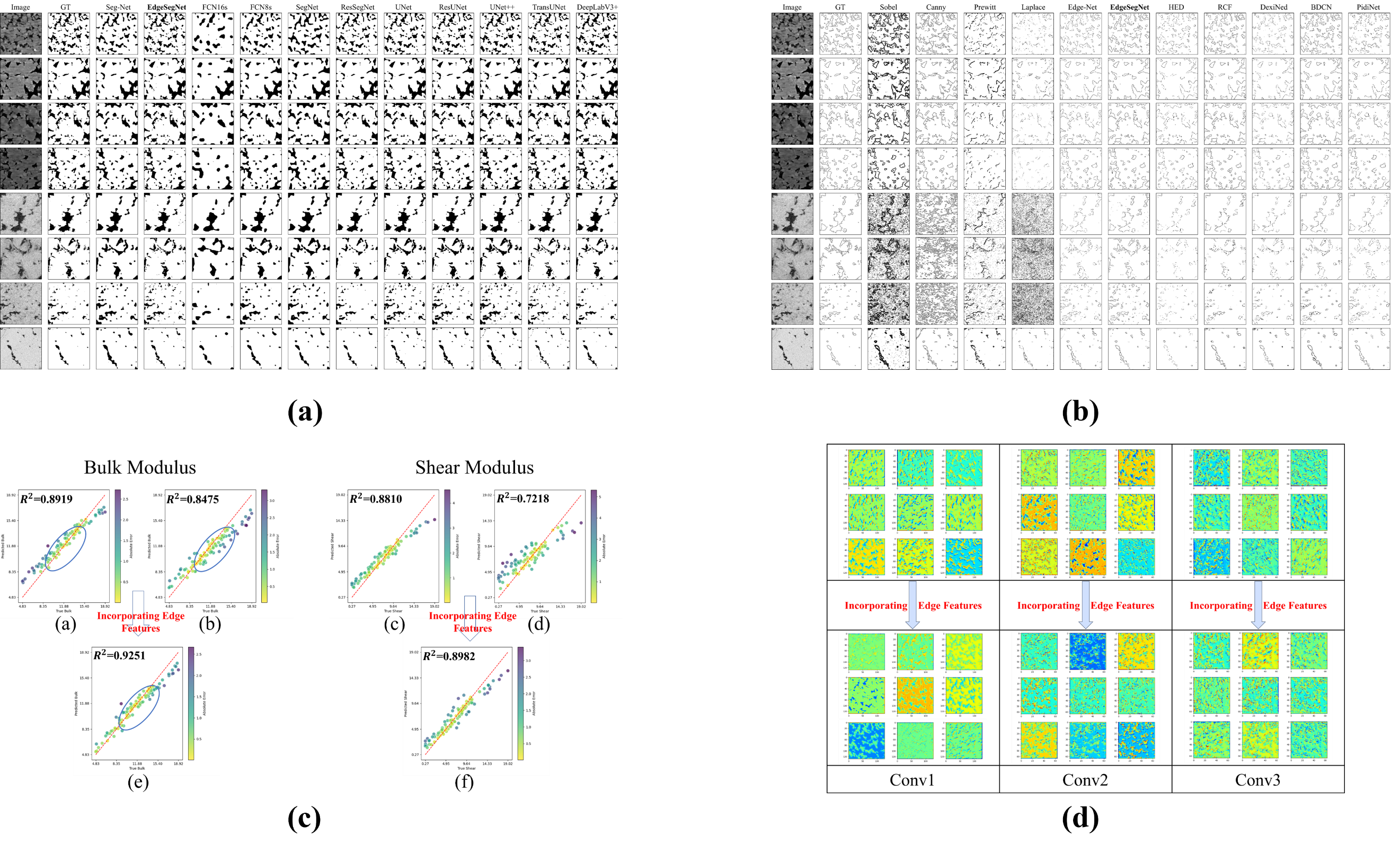 实验结果表明,EdgeSegNet在有限训练样本下实现了图像分割与边缘检测的高精度,IoU和Dice系数分别达到约94%和98%,优于多种主流方法。消融实验验证了IESL、ICM及深度监督模块对性能提升的关键作用。在力学性质预测方面,引入边缘特征的双通道输入显著提升了预测精度,R²分数相比仅使用分割结果的方法提高了0.03,尤其在处理复杂孔隙结构时表现更为明显。此外,EdgeSegNet在训练数据减半的情况下仍保持稳定的性能,展现出良好的泛化能力和少样本学习适应性,为数字岩石物理中的智能预处理与物性预测提供了高效、鲁棒的新路径。