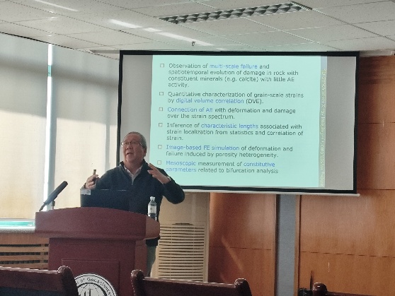 黄庭芳教授先后作了题为“数字岩石物理在渗流与岩石变形的应用”和“多孔岩石的脆性蠕变”学术报告。对于“数字岩石物理在渗流与岩石变形的应用”,报告结合其近年来在裂隙岩石各向异性孔弹性、基于显微CT图像的多尺度数字岩石建模、渗透率与地层因子预测,以及应力作用下孔隙介质渗流—变形耦合等方面的代表性成果,系统介绍了数字岩石物理从微观结构表征、数值模拟到宏观物性预测的研究路径。报告强调,数字岩石物理能够把孔隙结构、裂缝演化与流体运移、岩石变形有机联系起来,为储层评价、渗流机理分析及岩石力学行为研究提供重要理论与方法支撑,展示了该领域良好的应用前景。对于“多孔岩石的脆性蠕变”,报告结合其在多孔岩石脆—延性转变、脆性蠕变微观机制及损伤演化方面的代表性研究成果,系统阐述了孔隙结构、围压条件与微裂纹扩展对岩石时效变形和失稳破坏的控制作用。报告指出,多孔岩石的脆性蠕变本质上与微裂纹的萌生、扩展及相互作用密切相关,并受孔隙度、应力状态和环境条件共同影响。相关研究有助于深化对储层岩石长期稳定性、断裂演化及地质工程灾变过程的认识,为非常规储层开发、地下工程稳定性评价和地震孕育机制分析提供重要科学依据。