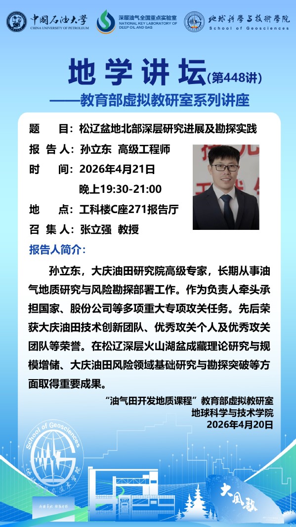 【地学讲坛第448讲】教育部虚拟教研室活动-关于孙立东高级工程师《松辽盆地北部深层研究进展及勘探实践》讲座的通知