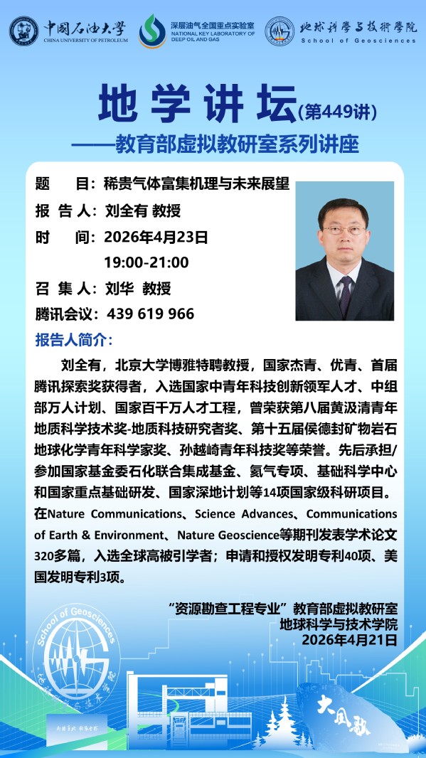 【地学讲坛第449讲】教育部虚拟教研室活动-关于刘全有 教授《稀贵气体富集机理与未来展望》讲座的通知