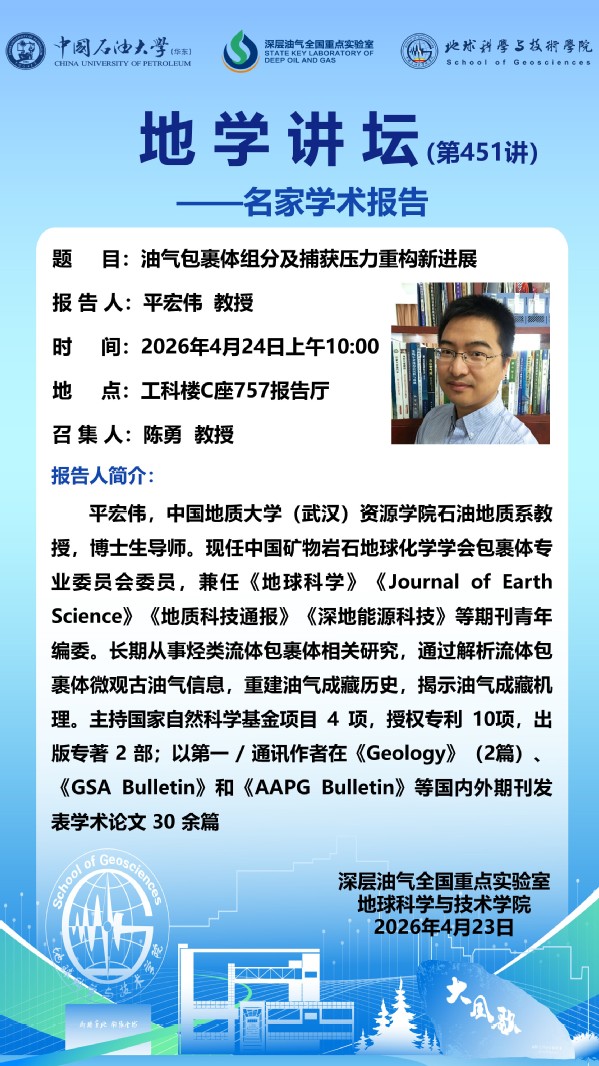 【地学讲坛第451讲】关于平宏伟教授《油气包裹体组分及捕获压力重构新进展》学术报告的通知
