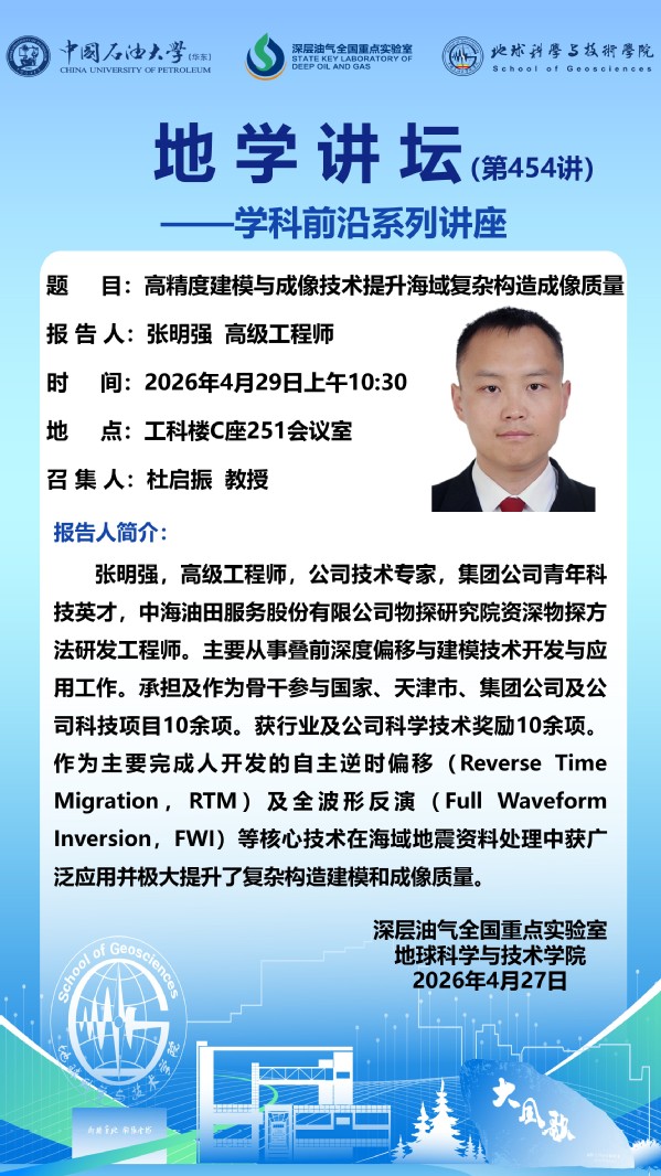 【地学讲坛第454讲】关于张明强高级工程师《高精度建模与成像技术提升海域复杂构造成像质量》学术报告的通知
